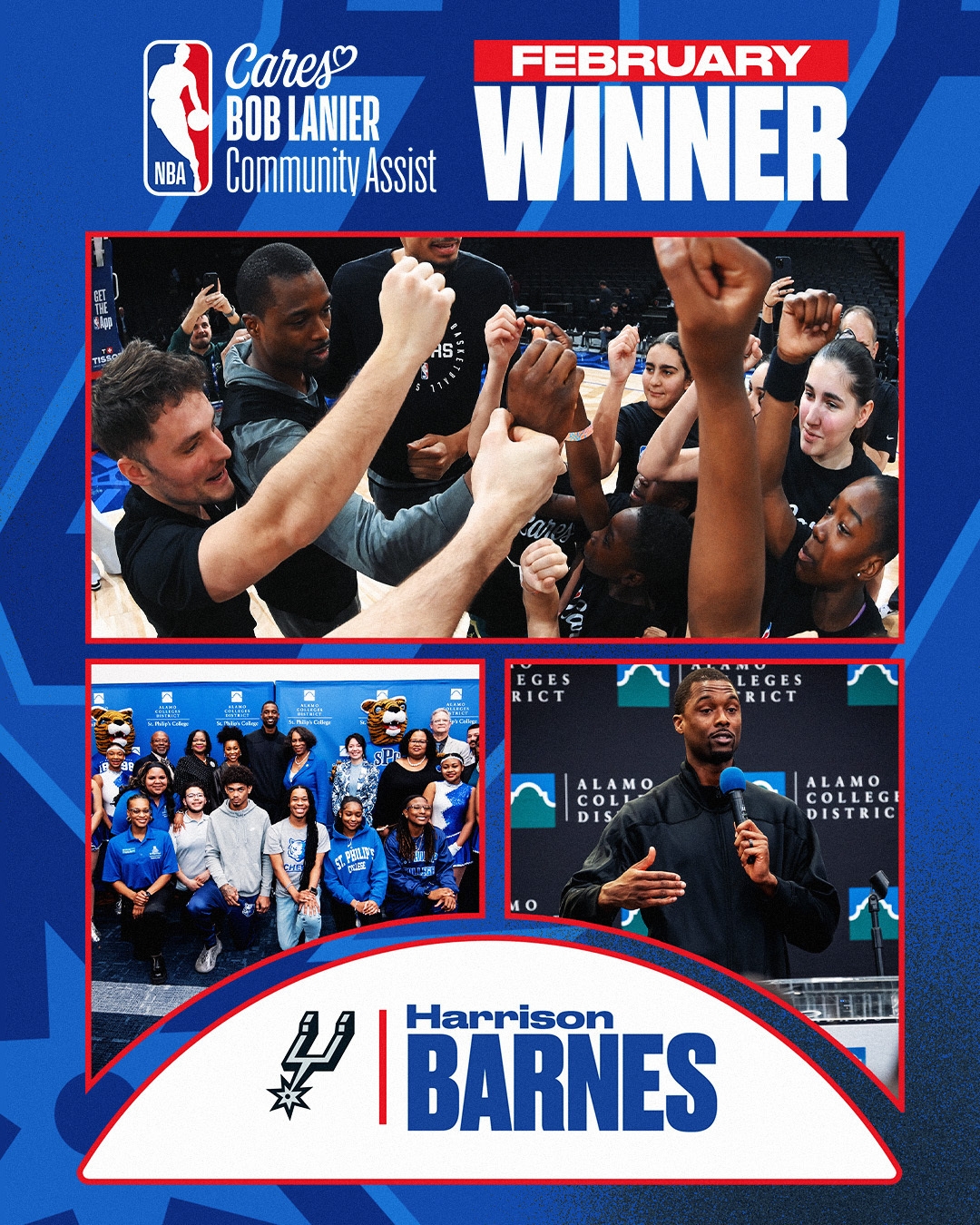 圣安東尼奧馬刺隊(duì)前鋒哈里森-巴恩斯被評(píng)為2月份的NBA“鮑勃-蘭尼爾”社區(qū)關(guān)懷援助獎(jiǎng)(Bob Lanier Community Assist Award)得主。巴恩斯和他的妻子布列塔尼向阿拉莫承諾項(xiàng)目(AlamoPROMISE)捐贈(zèng)了25萬(wàn)美元,該項(xiàng)目為符合條件的貝薩縣學(xué)生支付學(xué)費(fèi)和雜費(fèi)。