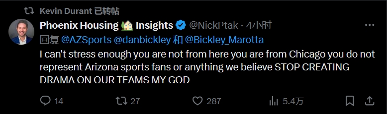 球迷一:我簡直不能更強調(diào)這一點,你不是本地人,你是芝加哥人,不能代表亞利桑那州的體育迷,也不能代表我們的任何想法。停止在我們的球隊制造鬧劇吧,老天??!