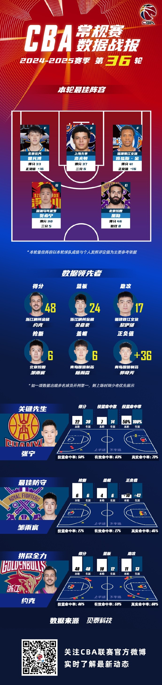 數(shù)據(jù)領(lǐng)先者方面:浙江稠州籃球俱樂(lè)部球員約克以單場(chǎng)48分的數(shù)據(jù)領(lǐng)銜得分榜;