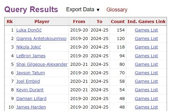 2020年以來的30+5+5場(chǎng)次榜單:東契奇155場(chǎng)居首 字母哥120場(chǎng)第2