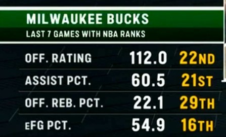 雄鹿近7場進(jìn)攻便秘:進(jìn)攻效率聯(lián)盟第22 助攻&前板百分比都20開外