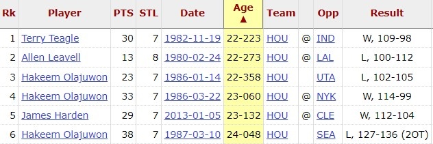阿門這樣一來,阿門(22歲51天)成為了火箭隊(duì)史上單場(chǎng)送出7+搶斷最年輕的球員,此前最年輕紀(jì)錄是特里-蒂格的22歲223天。