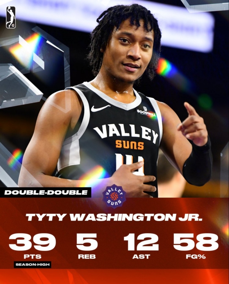 此役,前火箭球員小泰泰-華盛頓(效力于山谷太陽(yáng)、太陽(yáng)下屬G聯(lián)盟球隊(duì))出戰(zhàn)36分7秒,投籃26中15,三分9中4,罰球4中3,爆砍39分5籃板12助攻2搶斷。