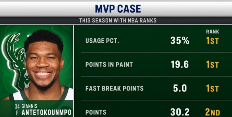 比賽開始前,電視轉(zhuǎn)播商列舉了字母哥競爭本賽季MVP的優(yōu)勢,賽季至今,字母哥的使用率35%,聯(lián)盟第1,場均禁區(qū)得分19.6分,聯(lián)盟第1,場均快攻得分5分,聯(lián)盟第1,場均30.2分,聯(lián)盟第2。