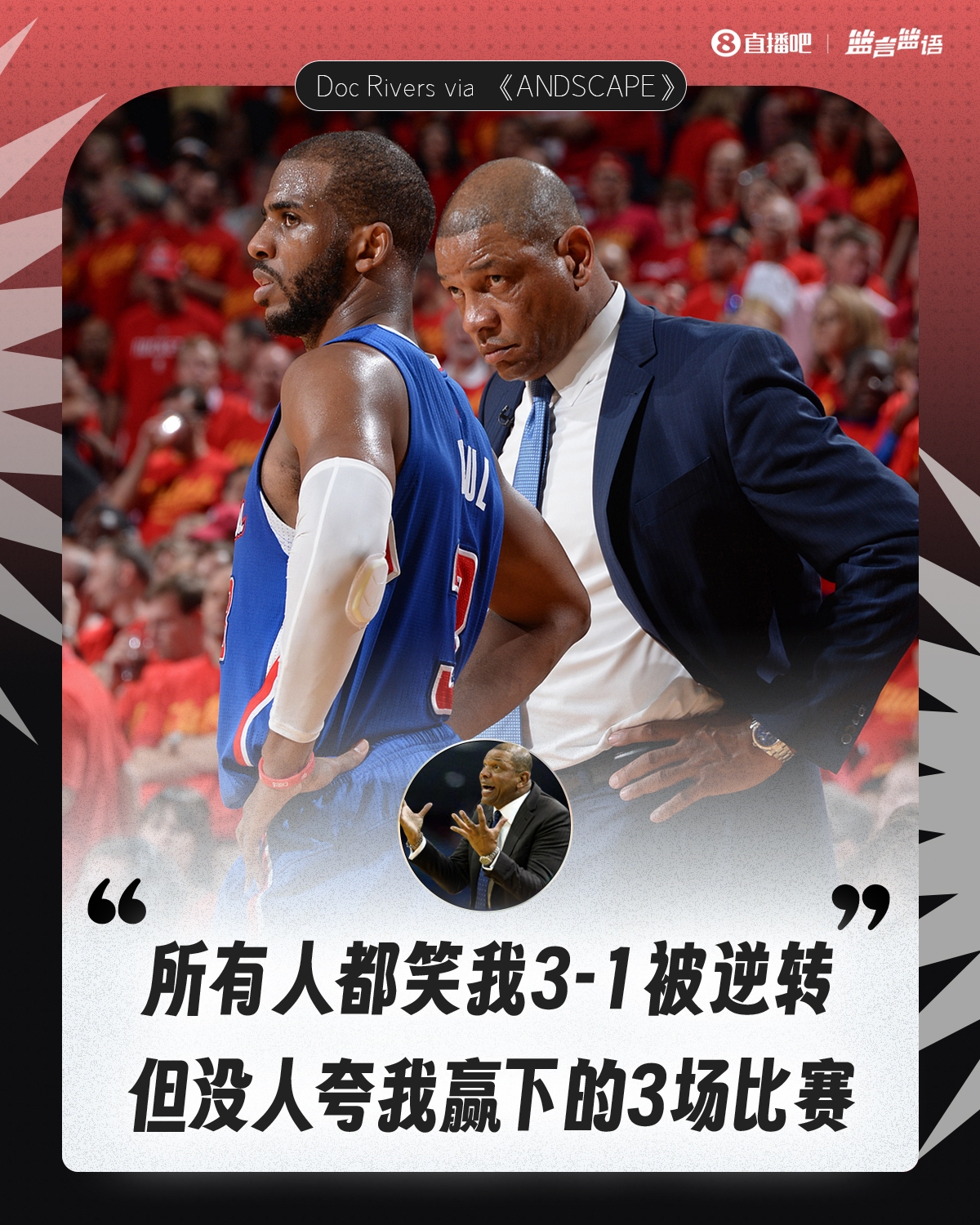在談到自己飽受詬病的“系列賽多次3比1領先被翻盤”的話題時,里弗斯坦然表示:“我曾帶領一支排名第8的球隊3比1領先。在快船的那次是唯一一次讓勝利溜走了,沒有人講出真實的故事,沒人意識到保羅當時拖著一條傷腿在場上奔跑。這在某種程度上是不公平的,我贏得3場勝利沒有得到足夠的認可,大家只記住了輸?shù)舻谋荣?。我總是說,‘如果我們6場內輸給火箭會怎樣?那就沒人在意了。