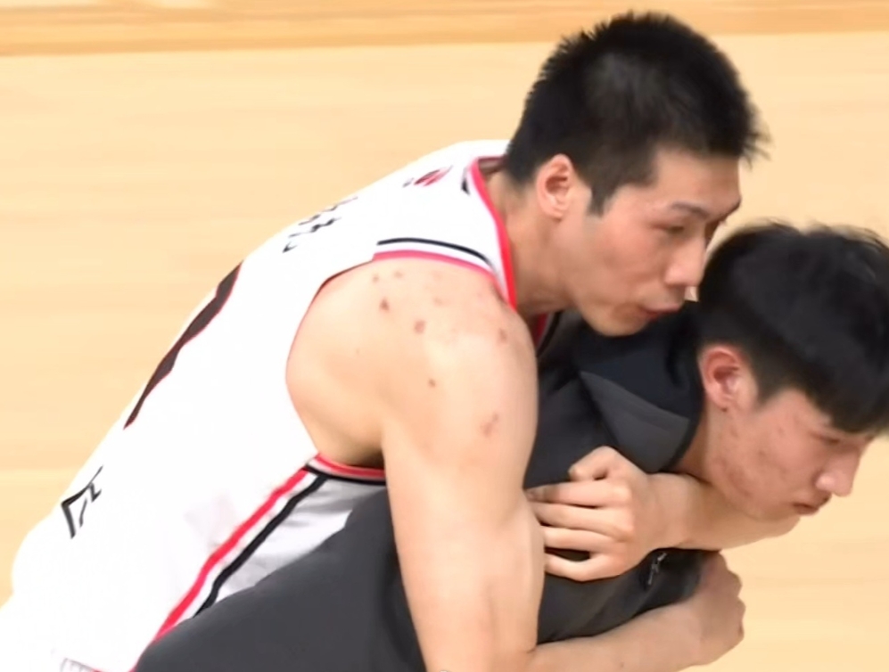 古德溫吃到違體犯規(guī),任駿飛被隊(duì)友背出去了,末節(jié)最后階段任駿飛重新回到場(chǎng)上