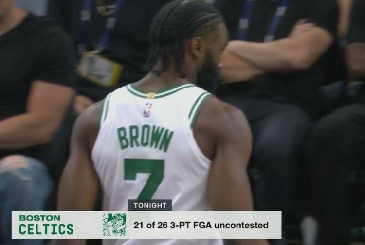 據(jù)統(tǒng)計(jì),凱爾特人本場(chǎng)前26次三分出手有21次是沒有干擾的。半場(chǎng)結(jié)束是,綠軍的三分球32投14中。