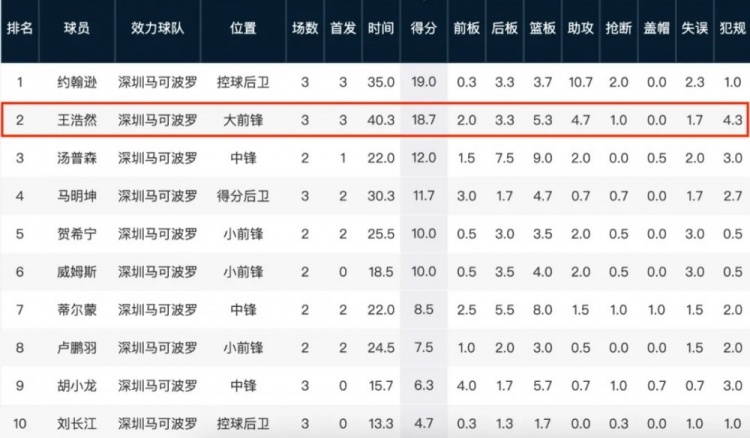 戲份增加的王浩然,產(chǎn)量也無愧于教練組的信任——他場(chǎng)均18.7分僅次于小外援約翰遜的19分,作為本土隊(duì)內(nèi)得分王的同時(shí),另外也有隊(duì)內(nèi)第4的5.3籃板,和第2的4.7次助攻。