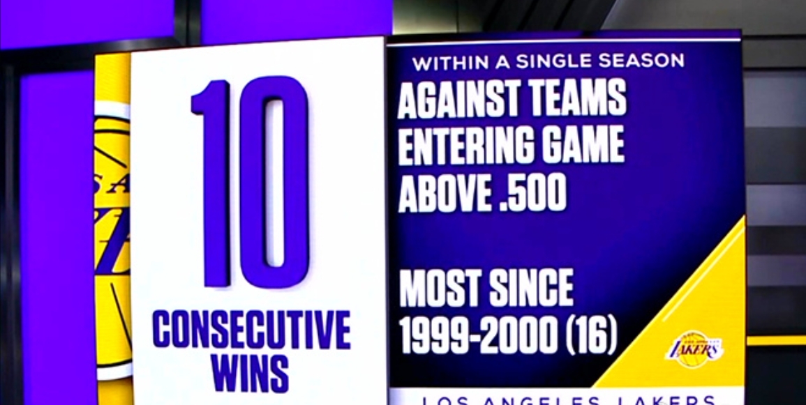 湖人本賽季面對勝率50%+球隊(duì)已十連勝 99-00賽季以來最長連勝紀(jì)錄