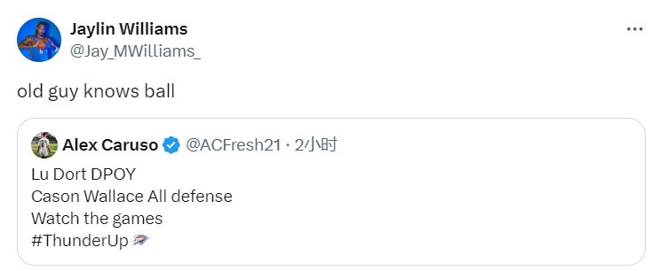 比賽結(jié)束后,卡魯索在社媒上為隊(duì)友多特和華萊士發(fā)聲,他在個(gè)人推特上寫(xiě)道:“多特DPOY,華萊士最佳防守陣容。”