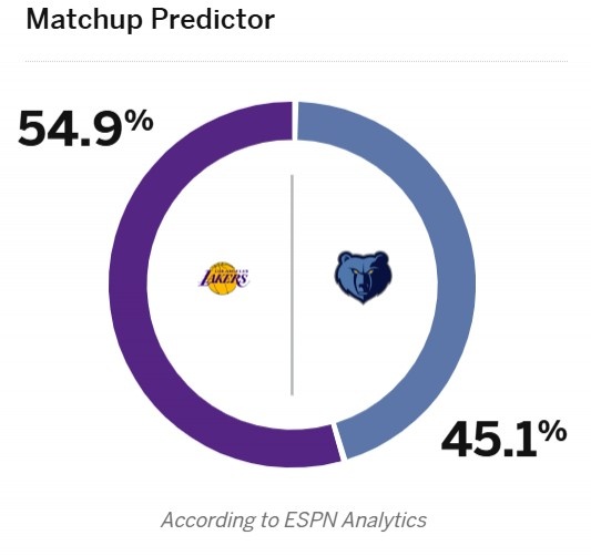 今天,ESPN預(yù)測本場比賽勝率,湖人54.9%,灰熊45.1%。