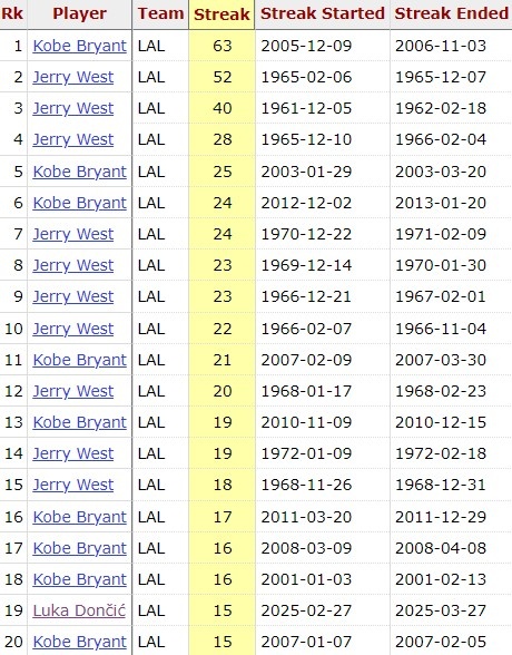 東契奇連續(xù)15場20+ 湖人隊(duì)史后衛(wèi)第3人 比肩科比和韋斯特