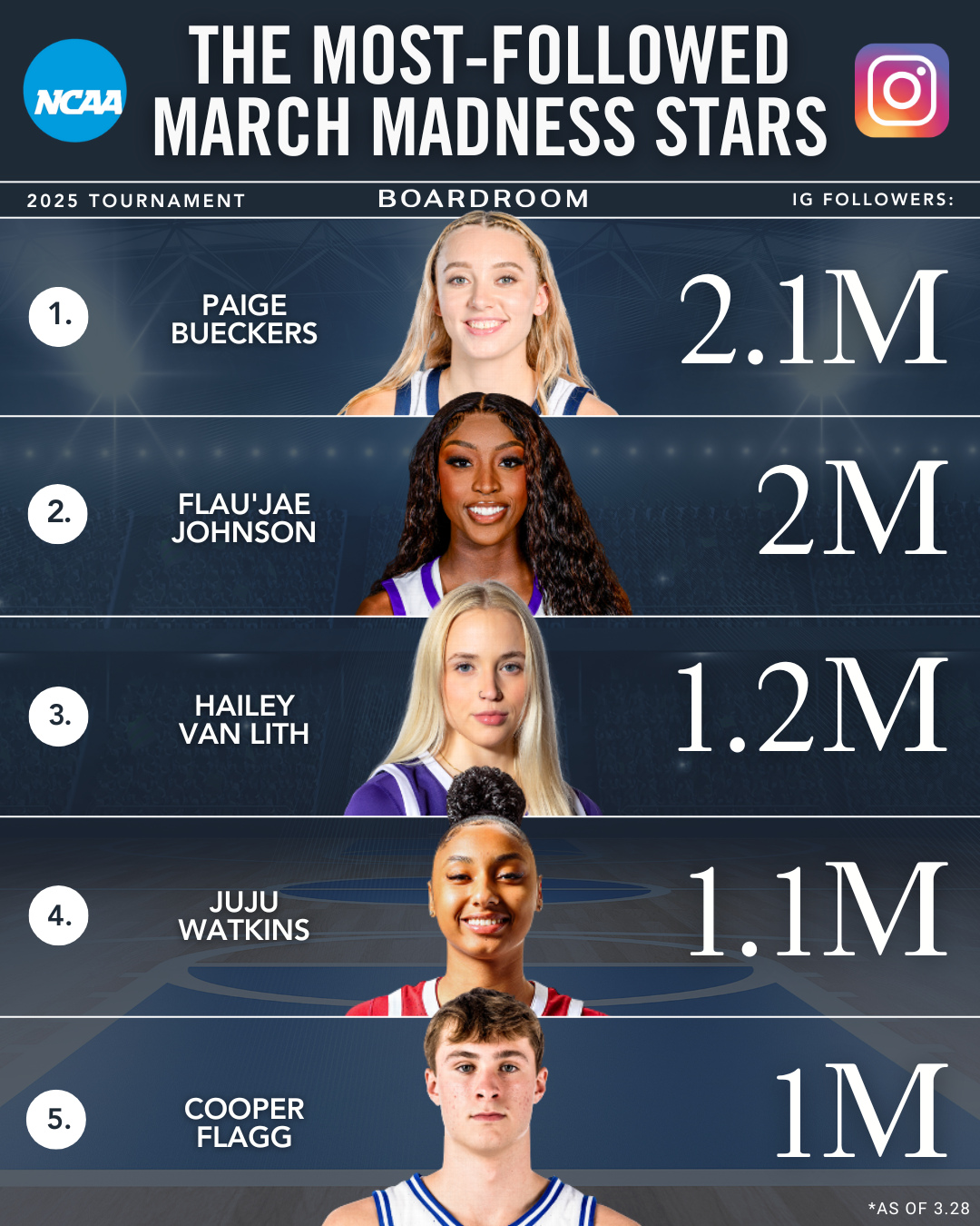 03月30日訊 美媒Boardroom今日統(tǒng)計了本屆NCAA瘋?cè)騿T的Instagram粉絲排名,NBA狀元大熱弗拉格以100萬粉絲排名第5,粉絲數(shù)“僅為”WNBA狀元大熱佩奇-布克斯的一半不到。