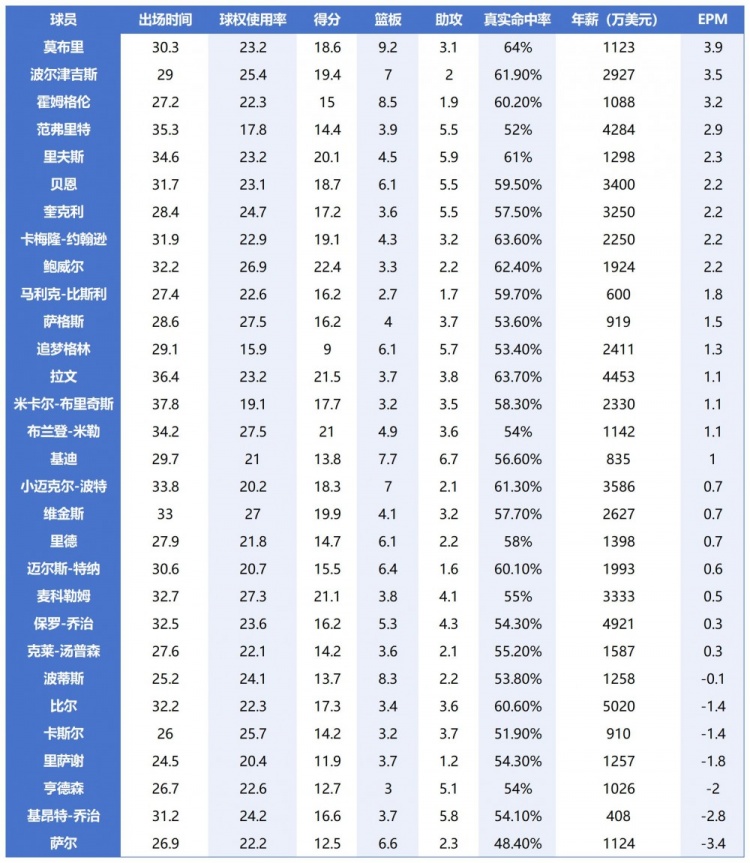 論綜合影響力,具備超強(qiáng)防守影響力的高大內(nèi)線優(yōu)勢(shì)巨大。30位三當(dāng)家EPM排行榜,莫布里、波爾津吉斯和霍姆格倫分列1-3位,他們所效力的球隊(duì)均是本賽季勝率前3位的強(qiáng)隊(duì)。考慮到他們3人攻防兼?zhèn)?,這個(gè)結(jié)果不讓人意外。
