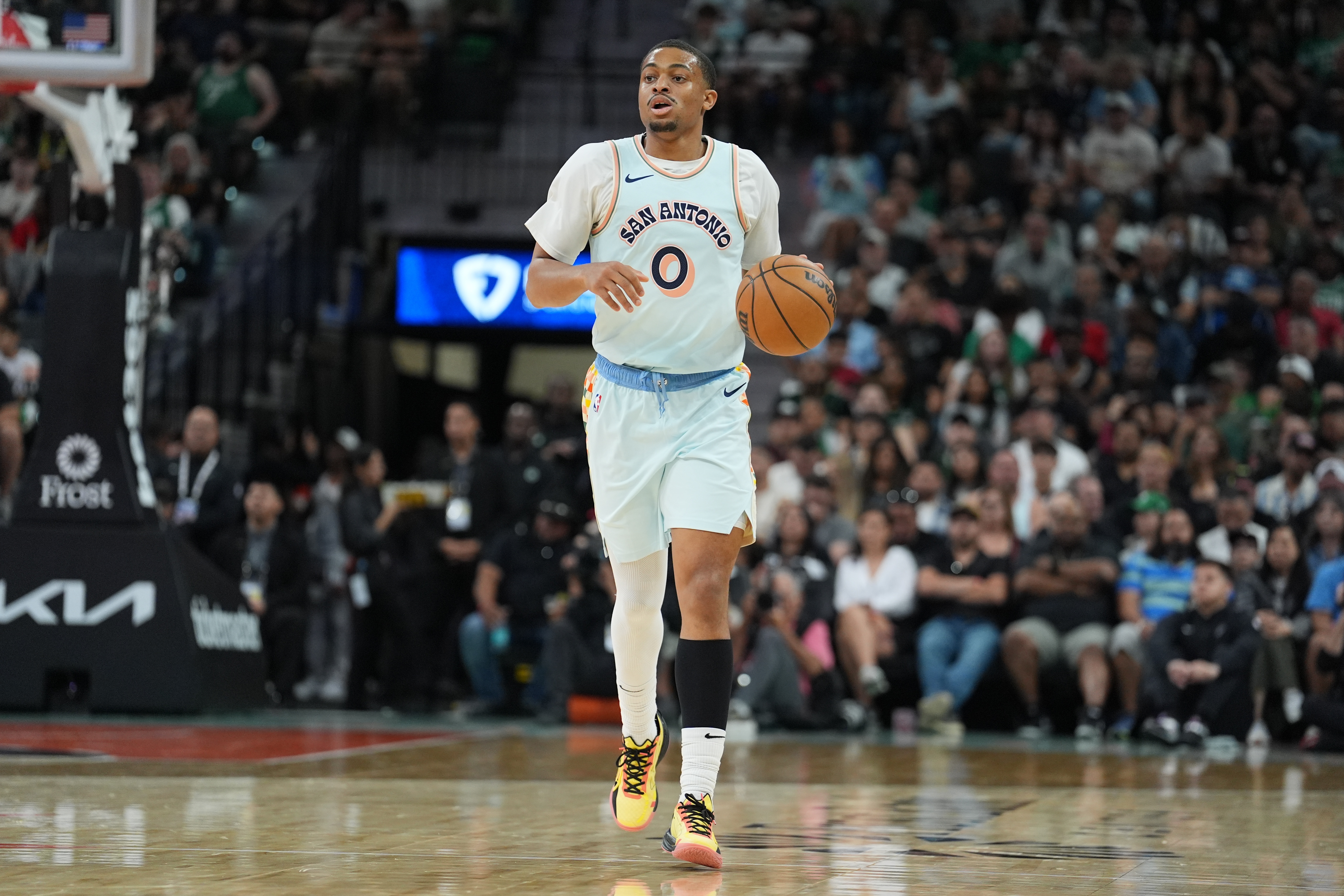 上半場比賽,馬刺全員狀態(tài)一般,只有凱爾登進(jìn)攻狀態(tài)不錯,苦苦支撐,他替補(bǔ)出戰(zhàn)15分鐘,8中6,三分3中1,罰球1中1拿到14分(全隊(duì)唯一上雙)1籃板2助攻,正負(fù)值-15。