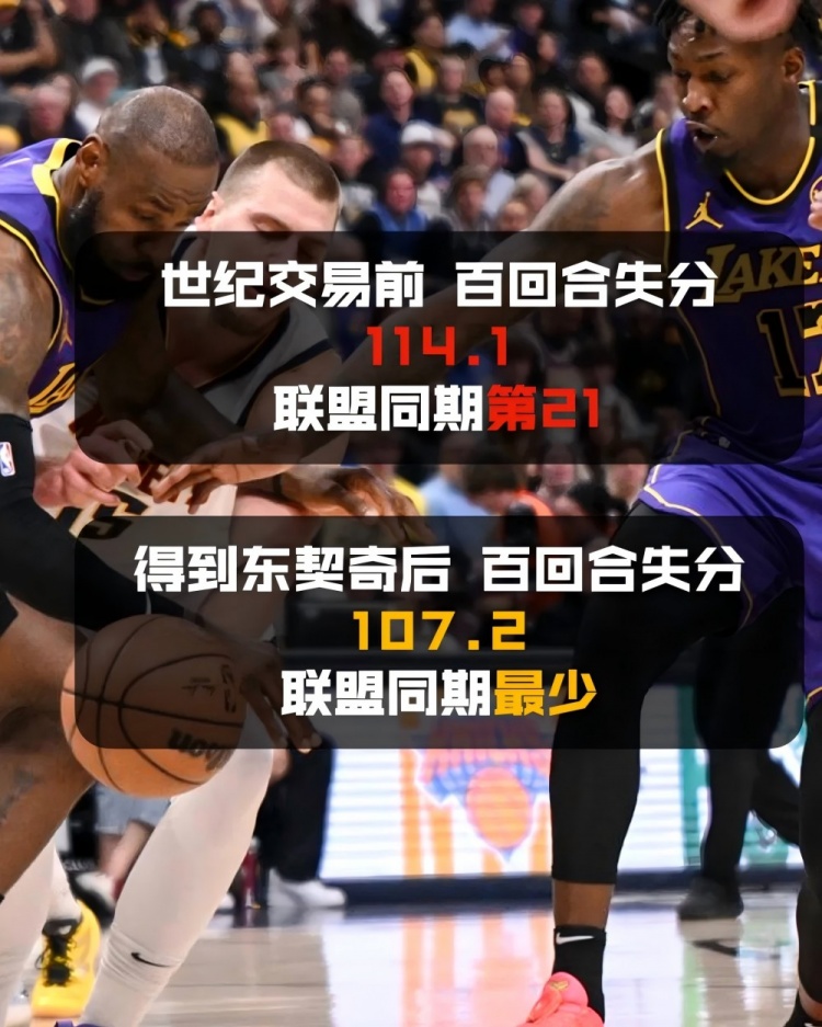 而比起進(jìn)攻端如虎添翼,令人驚訝的是,他們在防守端更是打出了前所未有的質(zhì)量。在一個(gè)被質(zhì)疑“防守有巨大問題”的東契奇加入之后,湖人隊(duì)反而成為百回合失分同期最少的球隊(duì)。他們每百回合足足少丟了6.9分,成為交易日后聯(lián)盟獨(dú)一檔的防守鐵軍。