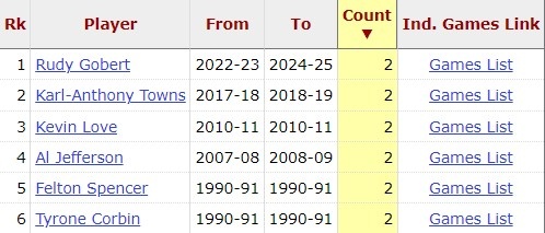 據(jù)統(tǒng)計(jì),這是戈貝爾到森林狼后第3次單場(chǎng)10+進(jìn)攻籃板,升至隊(duì)史第一。