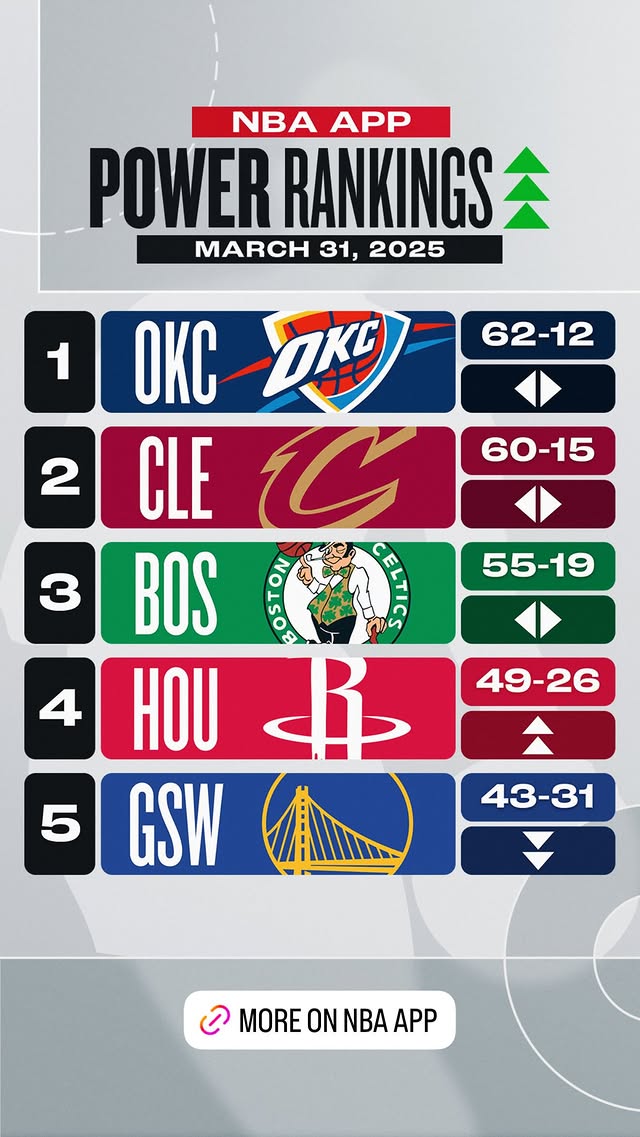 04月01日訊 今日NBA官方更新了最新一期戰(zhàn)力榜。雷霆仍居第一,近13場12勝的火箭狂飆4位升至前四,湖人跌出前五。