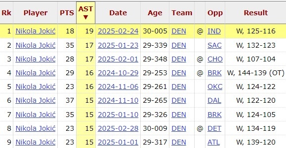 據(jù)統(tǒng)計,這是約基奇本賽季第10場比賽送出至少15助攻,僅次于特雷-楊(14場),而且約基奇這10場全勝!