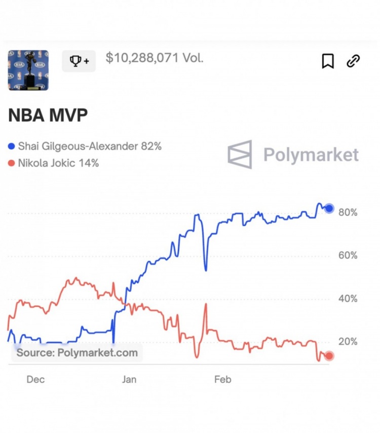 賽后美媒Polymarket更新了MVP概率,約基奇僅有14%,而亞歷山大則高達82%。