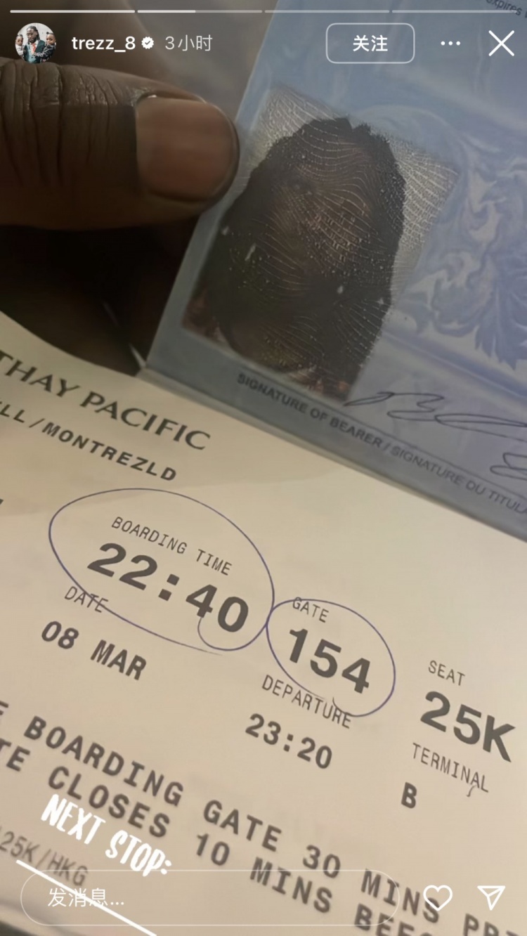 3月9日訊 哈雷爾今天更新社媒,曬出了自己的機(jī)票以及準(zhǔn)備登機(jī)的圖片。