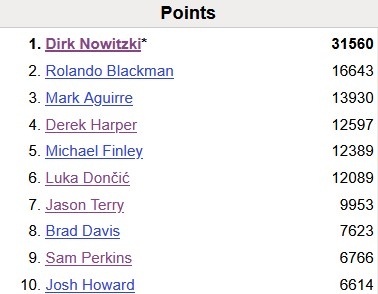 獨(dú)行俠隊(duì)史得分榜前十位