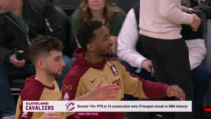 轉播方曬出數據,騎士目前取得14連勝,且這期間他們每場得分都是110+。這也追平了凱爾特人在1985-86賽季保持的NBA歷史紀錄!