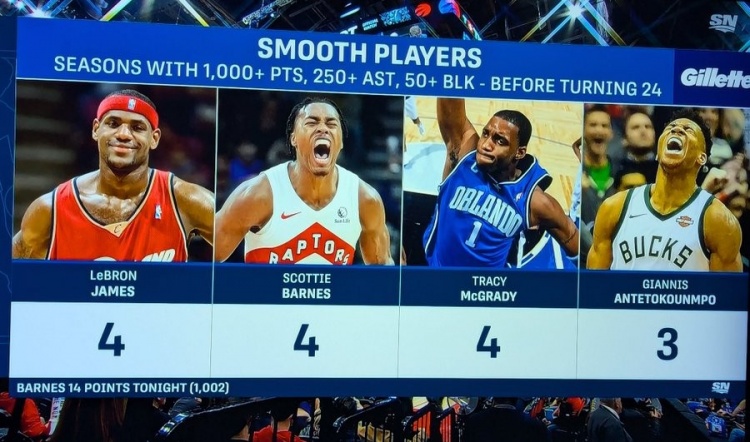 根據(jù)數(shù)據(jù)統(tǒng)計(jì),加上本場(chǎng)比賽,斯科蒂-巴恩斯本賽季的得分已經(jīng)突破1000分。生涯至今他已經(jīng)4次做到單賽季得分1000+助攻250+蓋帽50+,他追平詹姆斯和麥迪,成為25歲前單賽季得分1000+助攻250+蓋帽50+次數(shù)最多的球員。