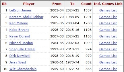 這是杜蘭特生涯(常規(guī)賽+季后賽)第1109場單場20+,超越科比,獨居歷史第四,僅次于詹姆斯(1537)、賈巴爾(1291)和卡爾-馬龍(1288)。