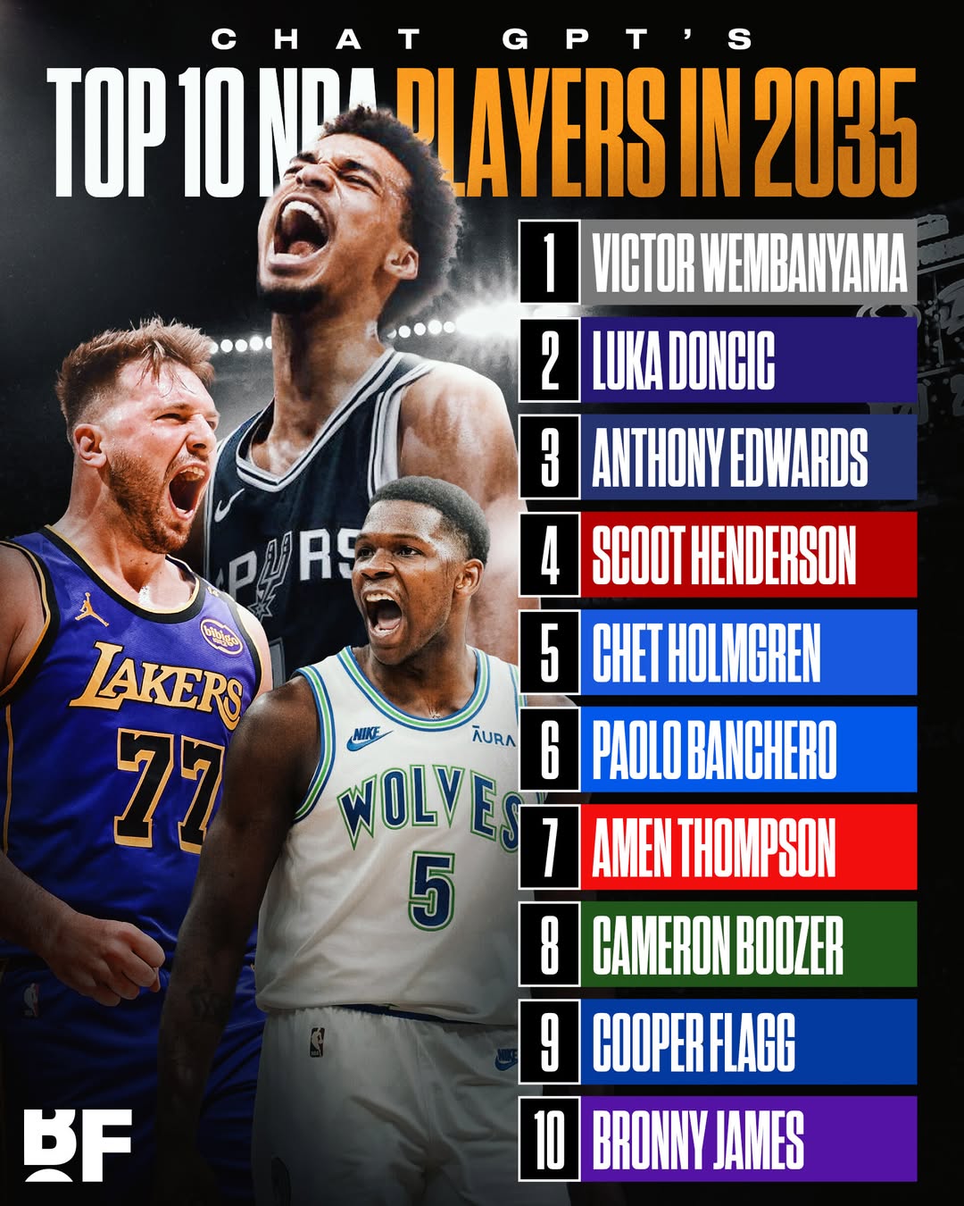 ChatGpt預測十年后前十球員:文班第一 東契奇第二 布朗尼第10