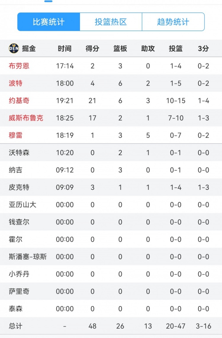 都是臥底?掘金全隊(duì)除約基奇和威少外合計(jì)22投3中 穆雷7中0