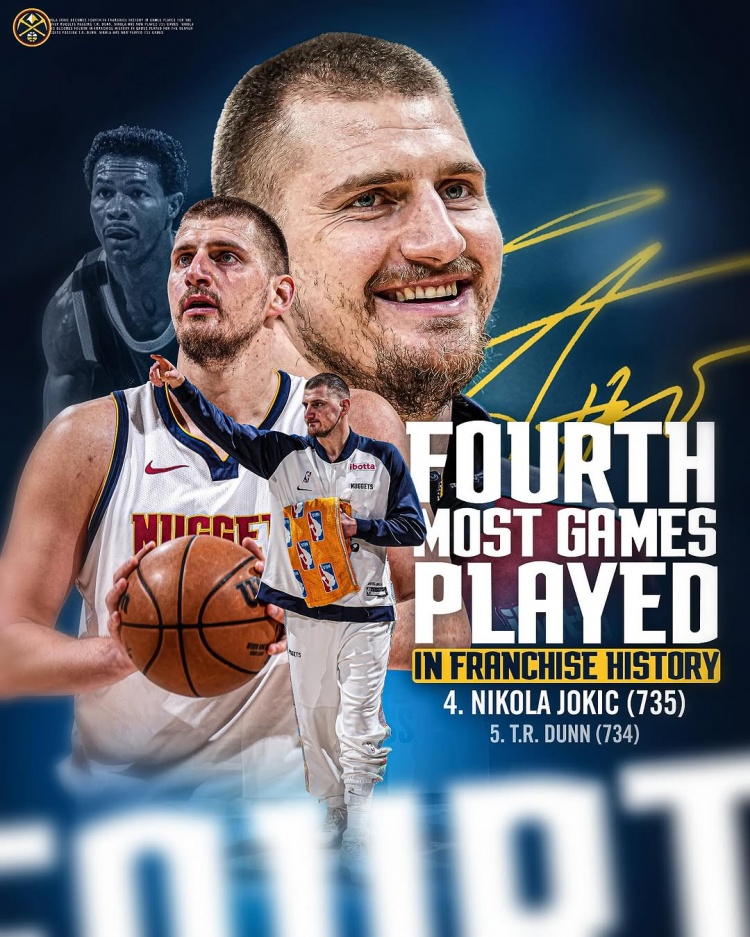 這是約基奇代表掘金出戰(zhàn)的第735場(chǎng)比賽,超越T.R-鄧恩,上升至隊(duì)史第四。