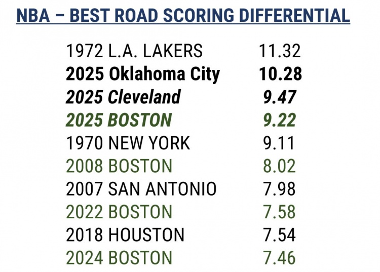歷史單賽季客戰(zhàn)場(chǎng)均凈勝分榜:72年湖人第一 今年雷騎綠有望沖擊