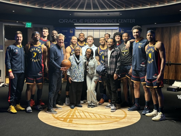 賽后,勇士隊(duì)工作人員做出溫馨的安排,阿爾-阿特爾斯的妻子將比賽用球交給了科爾,眾人一起合影留念。