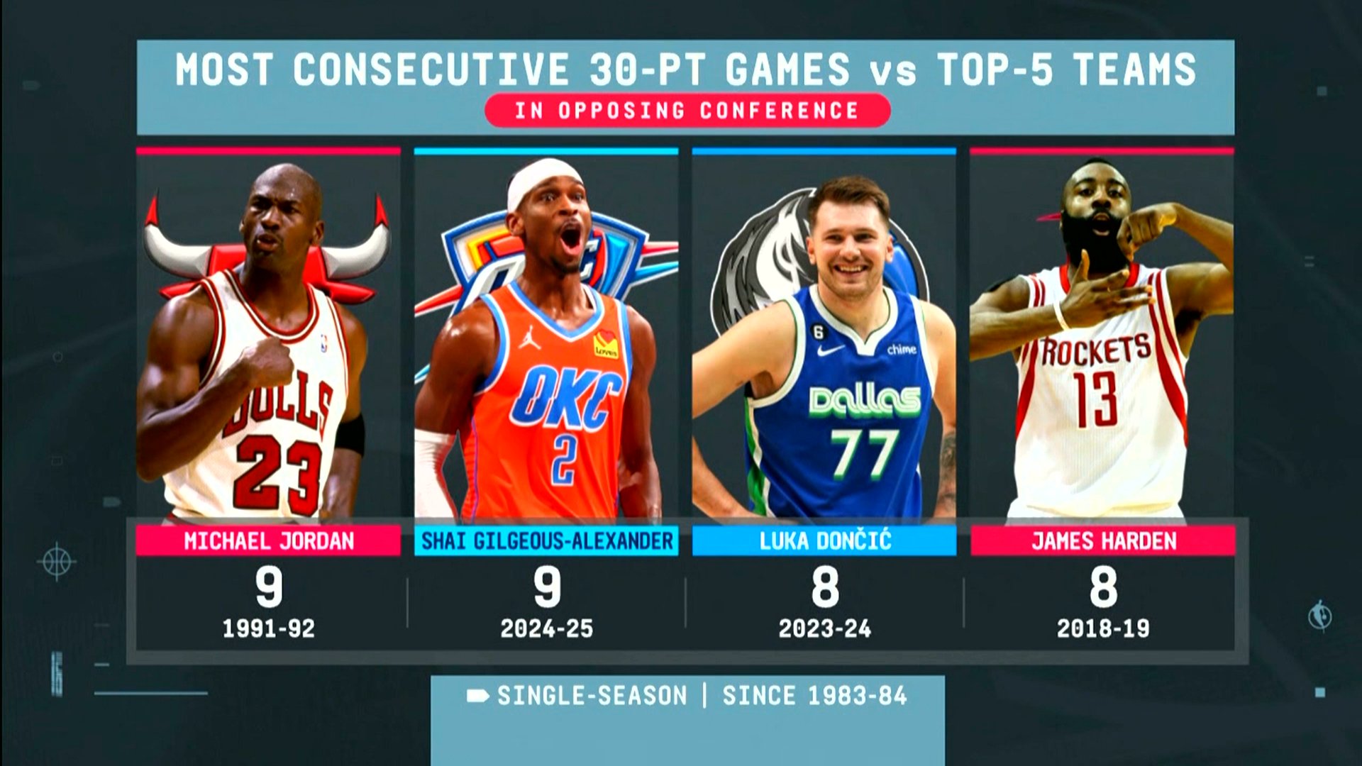 超東契奇+哈登!平喬丹??亞歷山大打?qū)Ψ桨雲(yún)^(qū)top5連續(xù)9場(chǎng)30+ !