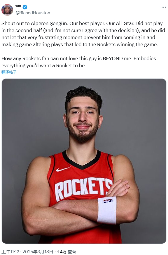 賽后,火箭的一位球迷評(píng)論道:“向申京致敬。他是我們最好的球員,我們的全明星。盡管下半場(chǎng)沒有上場(chǎng)(我對(duì)此決定并不完全贊同),但他并沒有讓這一令人沮喪的時(shí)刻影響自己,他在關(guān)鍵時(shí)刻挺身而出,為火箭贏得了比賽。任何火箭球迷如果不愛這個(gè)小伙子,那真是難以理解。他完美地展現(xiàn)了火箭球員應(yīng)有的所有品質(zhì)?!?/p>
