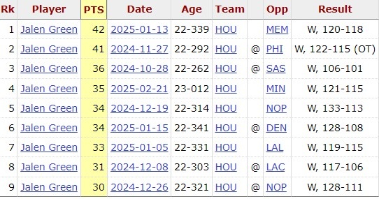 據(jù)統(tǒng)計,這是杰倫-格林本賽季第10場30+,而這10場火箭全勝!