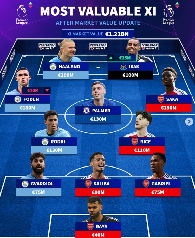 德轉(zhuǎn)列英超最貴陣:阿森納5人、曼城4將,帕爾默、伊薩克在列