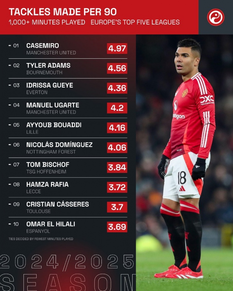 五大聯(lián)賽每90分鐘搶斷榜:卡塞米羅居首,亞當斯、蓋耶二三位