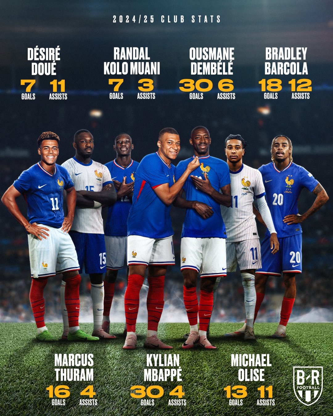 本賽季到目前為止,法國隊7名進(jìn)攻球員(杜埃、穆阿尼、登貝萊、巴爾科拉、小圖拉姆、姆巴佩、奧利賽)的統(tǒng)計數(shù)據(jù)為: