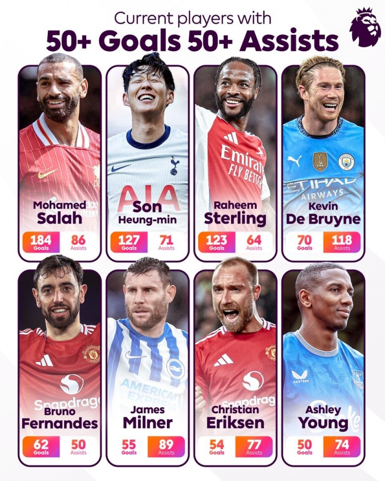 官方統(tǒng)計(jì)當(dāng)前仍效力英超進(jìn)球+助攻雙50+球員: