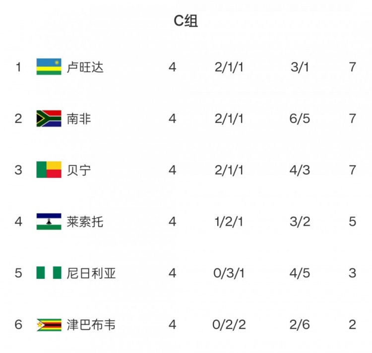 C組:盧旺達(dá)、南非、貝寧同積7分,競爭激烈!尼日利亞4輪僅3分,出線告急!