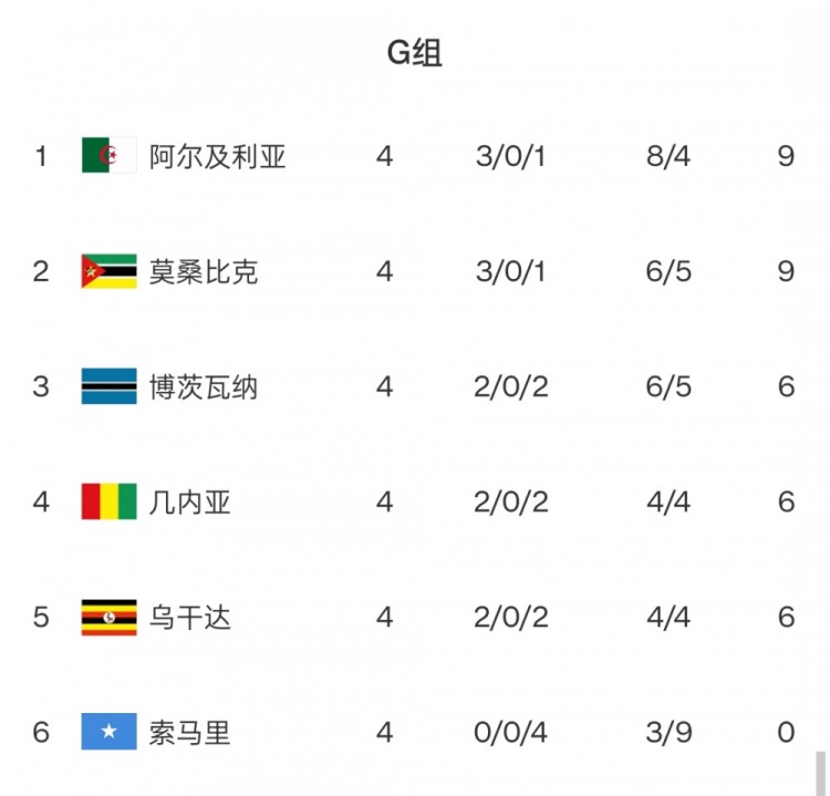 G組:阿爾及利亞、莫桑比克同積9分,3-5名同積6分,后續(xù)交手均不容有失