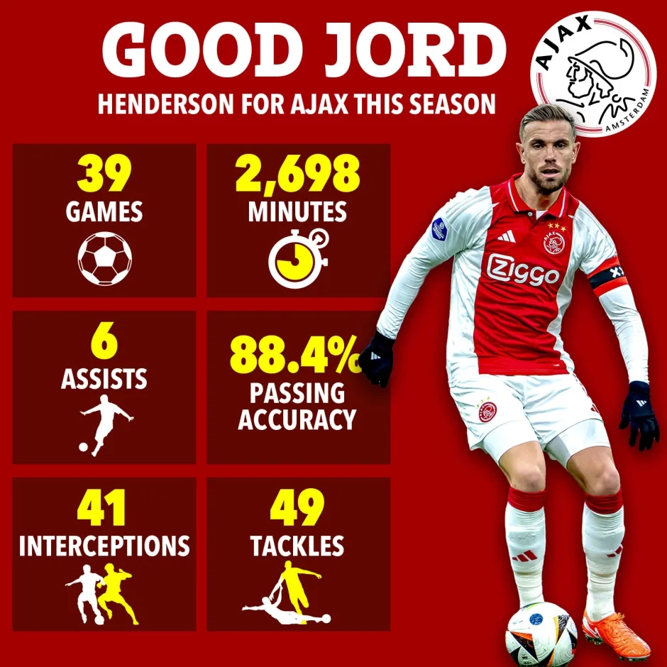 本賽季,喬丹-亨德森在阿賈克斯發(fā)揮不俗,他出戰(zhàn)39場(chǎng)比賽共計(jì)2698分鐘,貢獻(xiàn)6次助攻,傳球成功率88.4%,同時(shí)還有41次攔截和49次鏟搶。