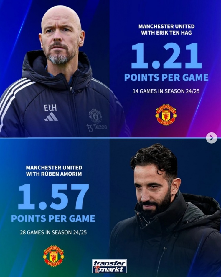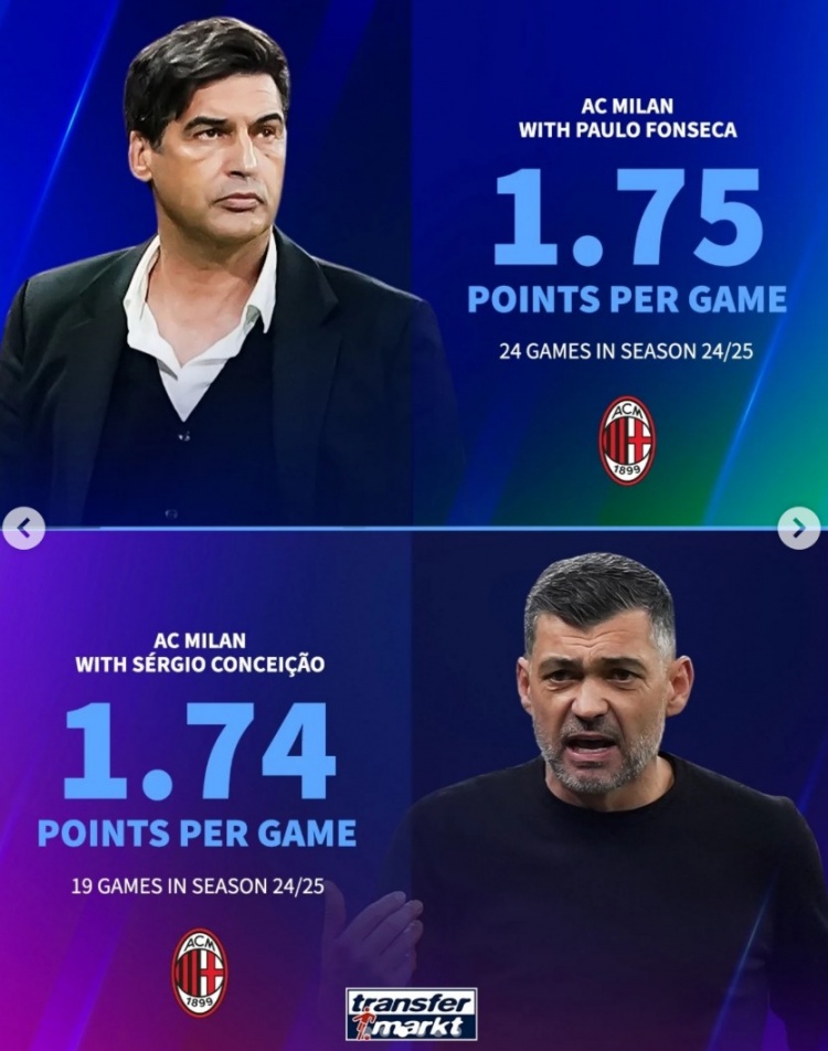 本賽季中途換帥6支球隊(duì)場(chǎng)均積分變化:曼聯(lián)提升0.36分,米蘭下降