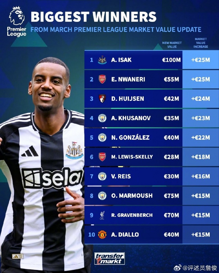 球員身價(jià)漲幅方面,伊薩克、恩瓦內(nèi)利以2500萬(wàn)歐的漲幅并列最多;跌幅方面,努涅斯、霍伊倫、B席均下跌1500萬(wàn)歐并列最多,槍手中場(chǎng)梅里諾下跌1000萬(wàn)歐,并列排第4位。