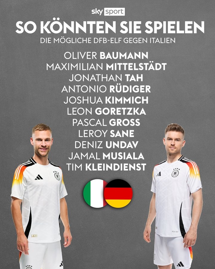 3月20日訊 在3月21日凌晨03:45,歐國(guó)聯(lián)1/4賽決賽首回合,德國(guó)即將客場(chǎng)挑戰(zhàn)意大利。德天空預(yù)測(cè)了德國(guó)隊(duì)首發(fā)陣容,拜仁多人入選。