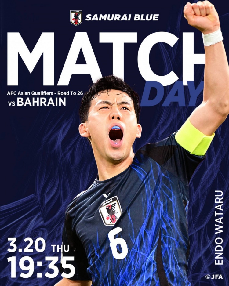日本隊(duì)公布戰(zhàn)巴林海報(bào):隊(duì)長(zhǎng)遠(yuǎn)藤航單人入鏡,振臂高呼