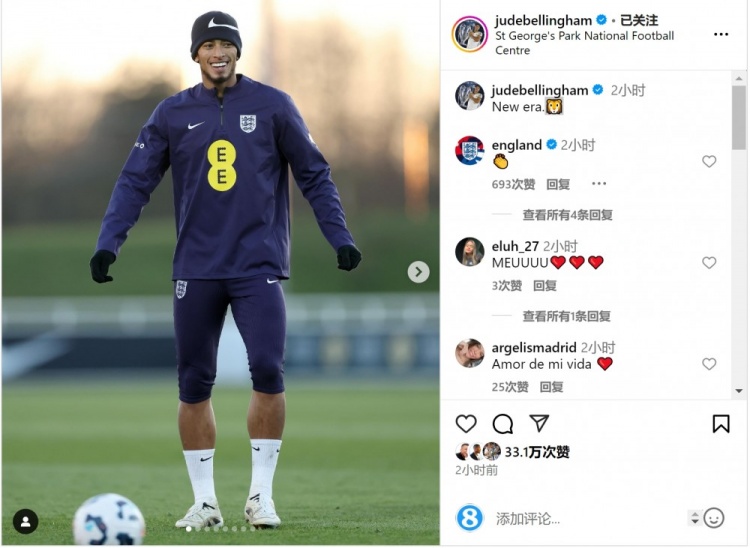 貝林厄姆隨英格蘭隊(duì)備戰(zhàn)世預(yù)賽,他在社交媒體上曬出訓(xùn)練照片,并配文:“新時(shí)代????