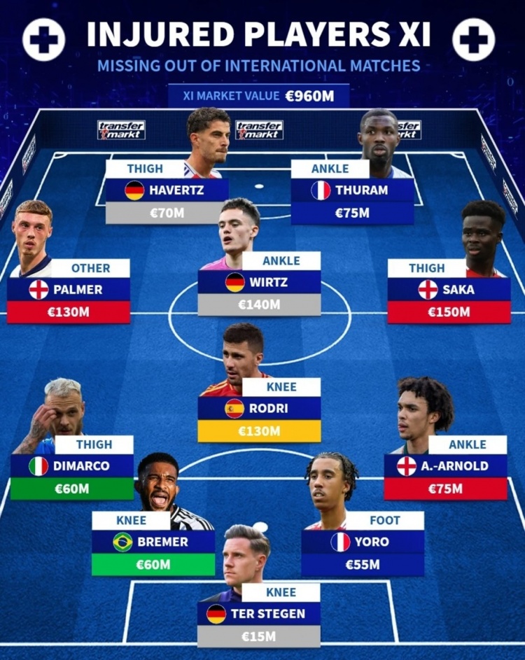 德轉(zhuǎn)列傷缺國家隊陣容:薩卡、維爾茨、羅德里在列,總價9.6億歐